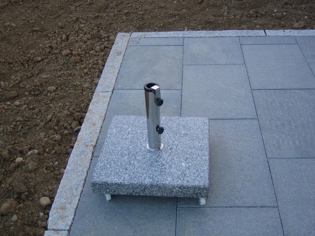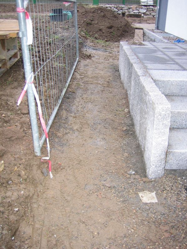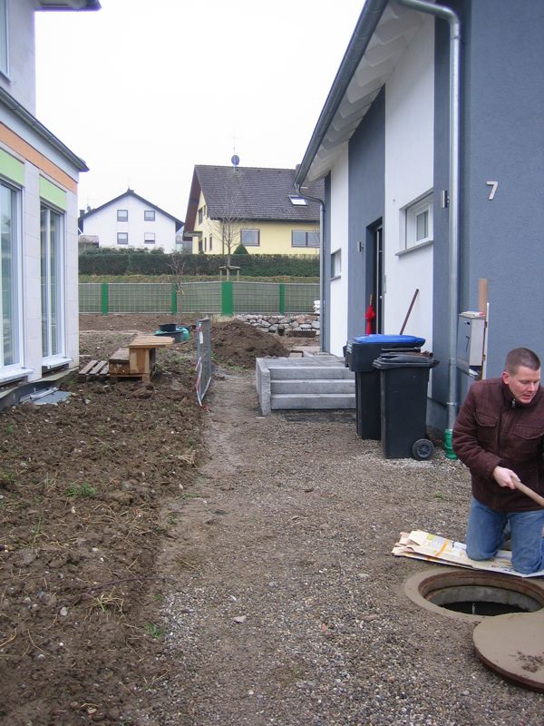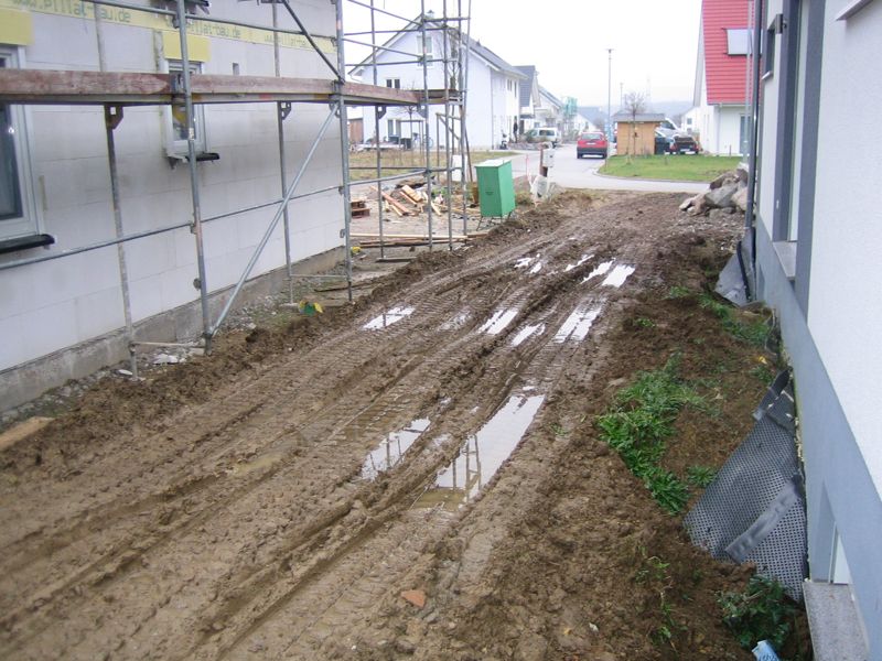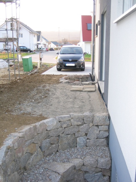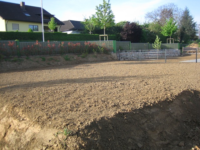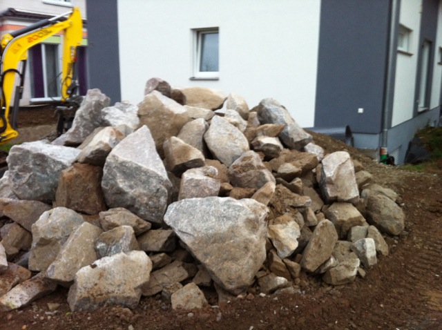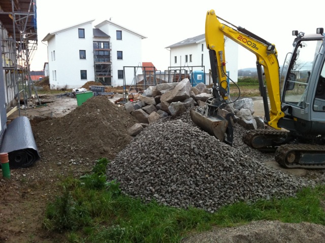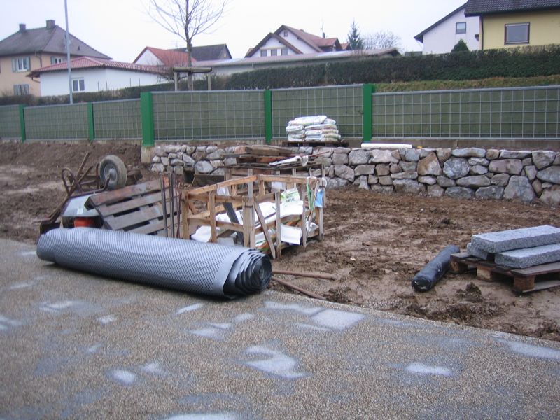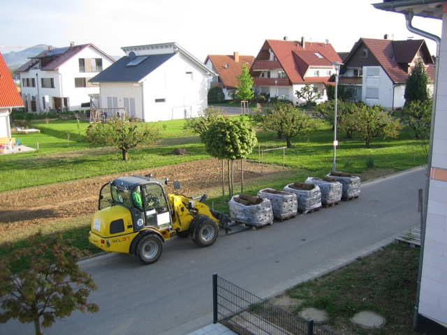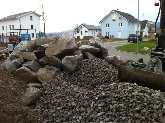 Also wird es Zeit, die alten Pläne, die bereits bei der Hausplanung gemacht wurden, in die Tat umzusetzen. Das notwendige Material wird berechnet und kalkuliert, Baumärkte besucht und Beratungen eingeholt und schließlich wird noch überlegt, was denn nun genau gemacht werden soll und wie. Bei den Arbeiten des GaLa-Bauers wurde bereits der Unterbau vorbereitet, sodass nun das seit Jahren rumliegende Unkrautvlies zu seinem Einsatz kommen sollte. Obendrauf etwas Split, den netterweise ein Kollege von mir kurz vor seinem Urlaub geholt hat. Aber wenn man so im Kieswerk steht, verschätzt man sich mit den Dimensionen etwas… Nach meiner Rechnung hätten 0,4 Kubikmeter Splitt gereicht, die Schaufel des Radladers war vielleicht zu einem Fünftel gefüllt und auf der Waage haben wir dann erfahren, dass 900kg Splitt (8/11er) für stolze 13 Euro den Besitzer wechseln.