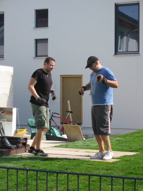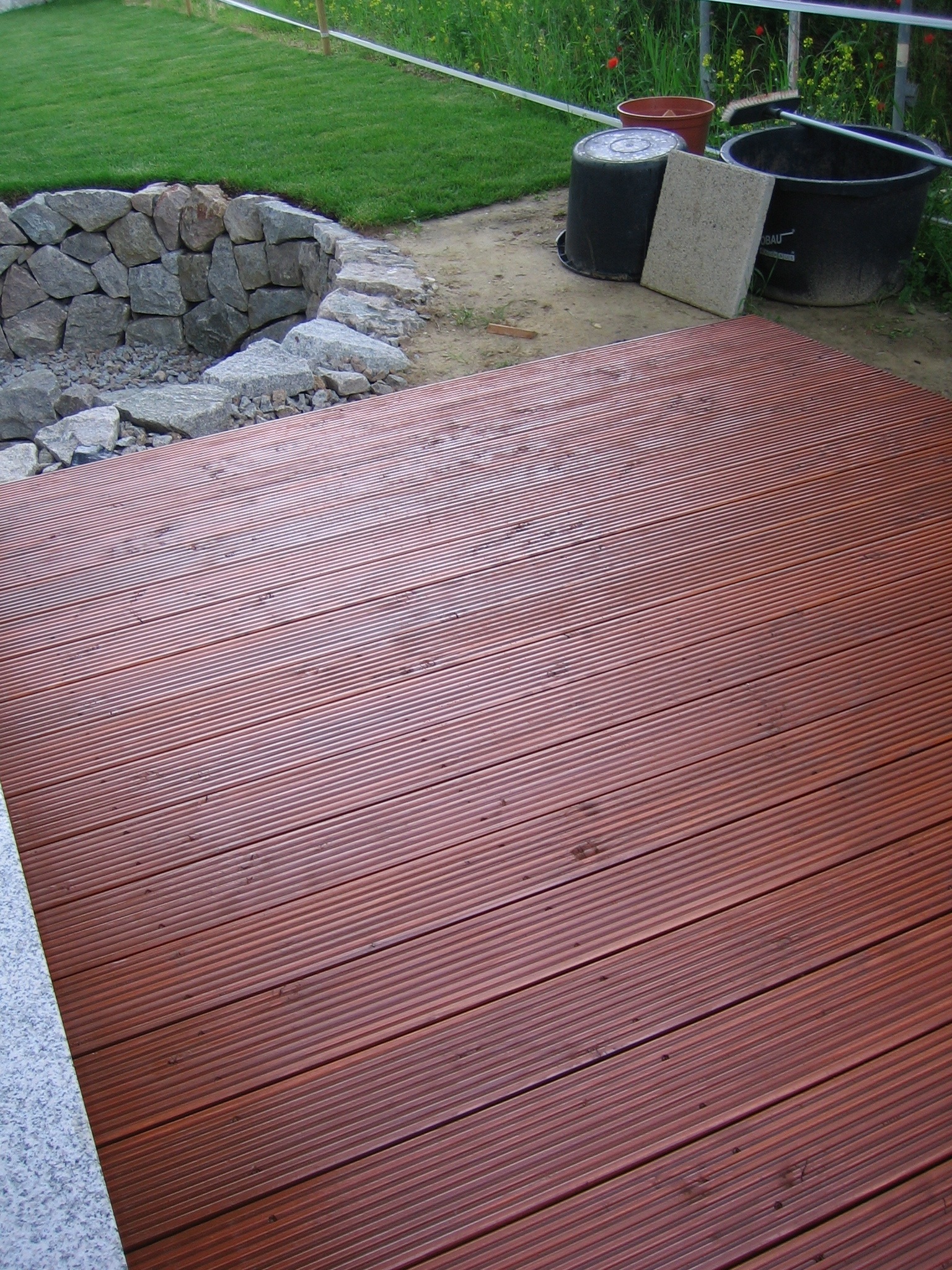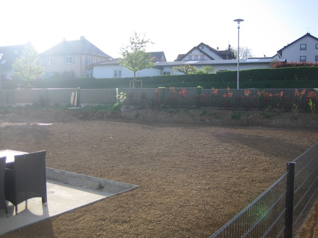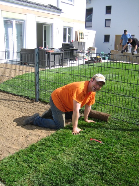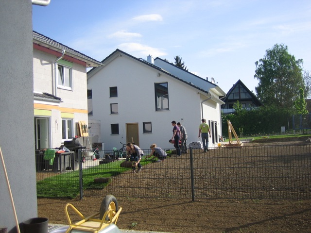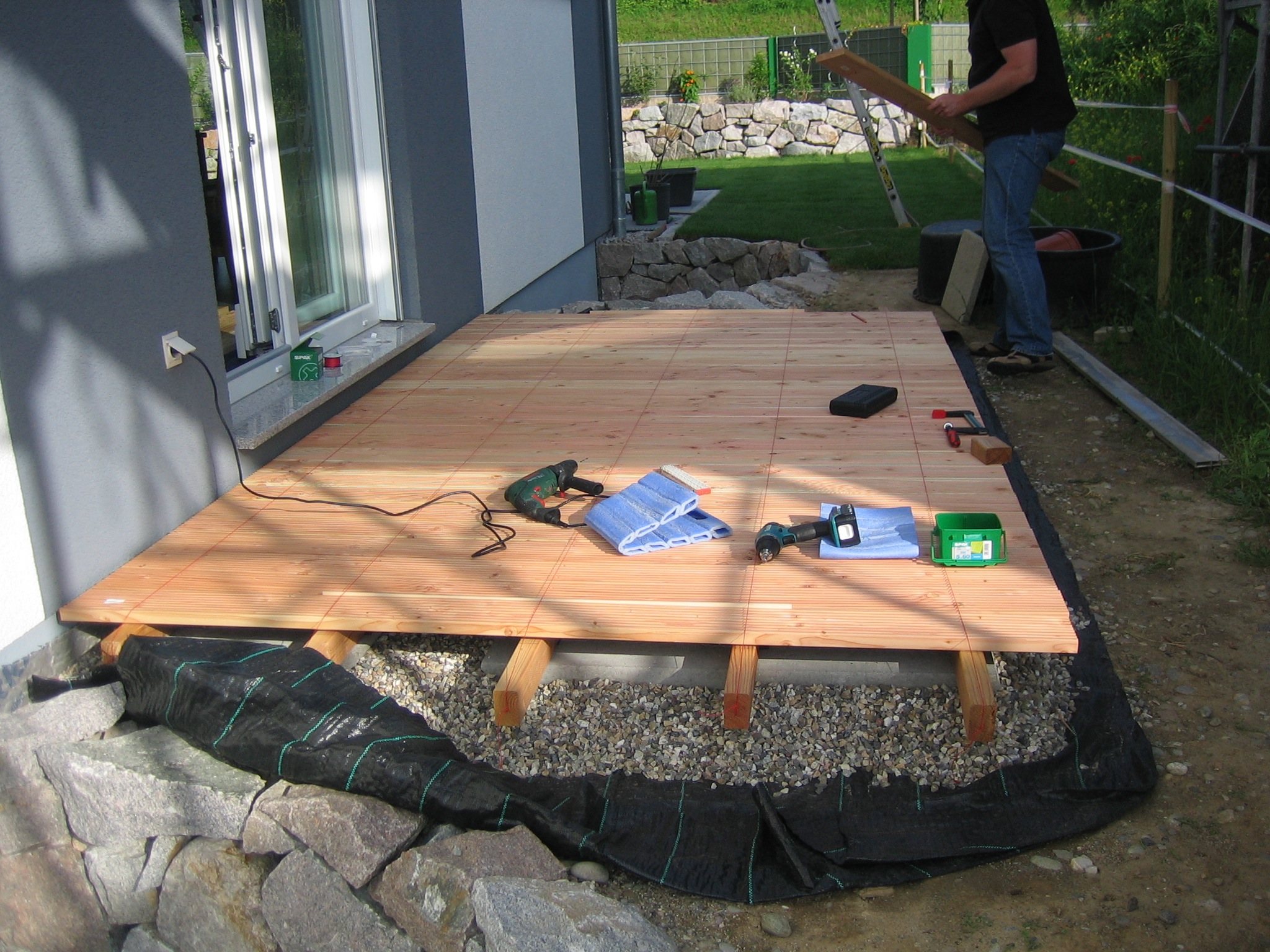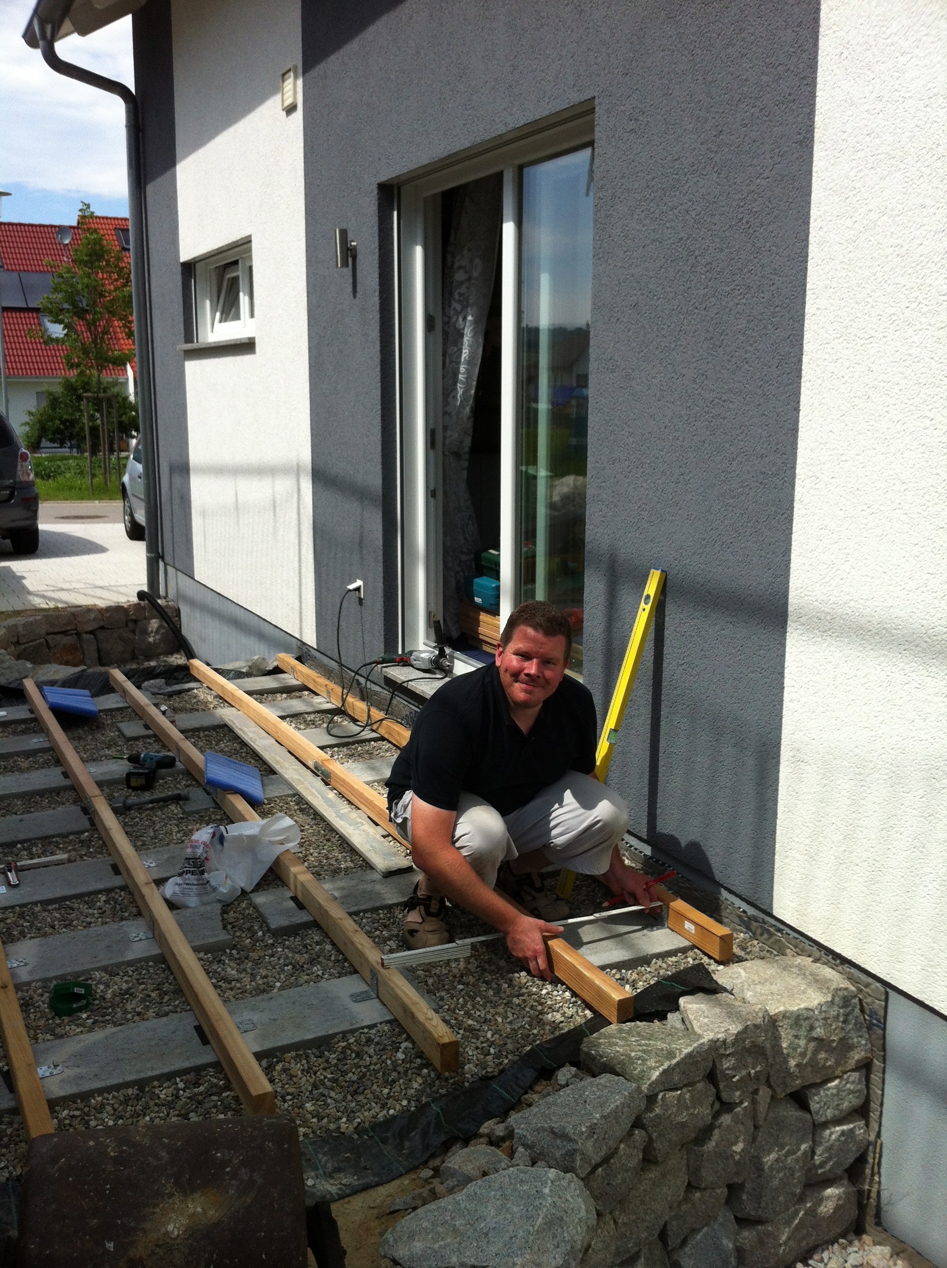 Nachdem der Rasen liegt, gewässert, gemäht und auch schon gedüngt wurde, ist es an der Zeit gewesen, ein weiteres Projekt in Angriff zu nehmen: Vor die zweite Terrassentür soll ein Holzdeck entstehen, die gemütliche Ecke für das Glas Rotwein am Abend soll es werden…