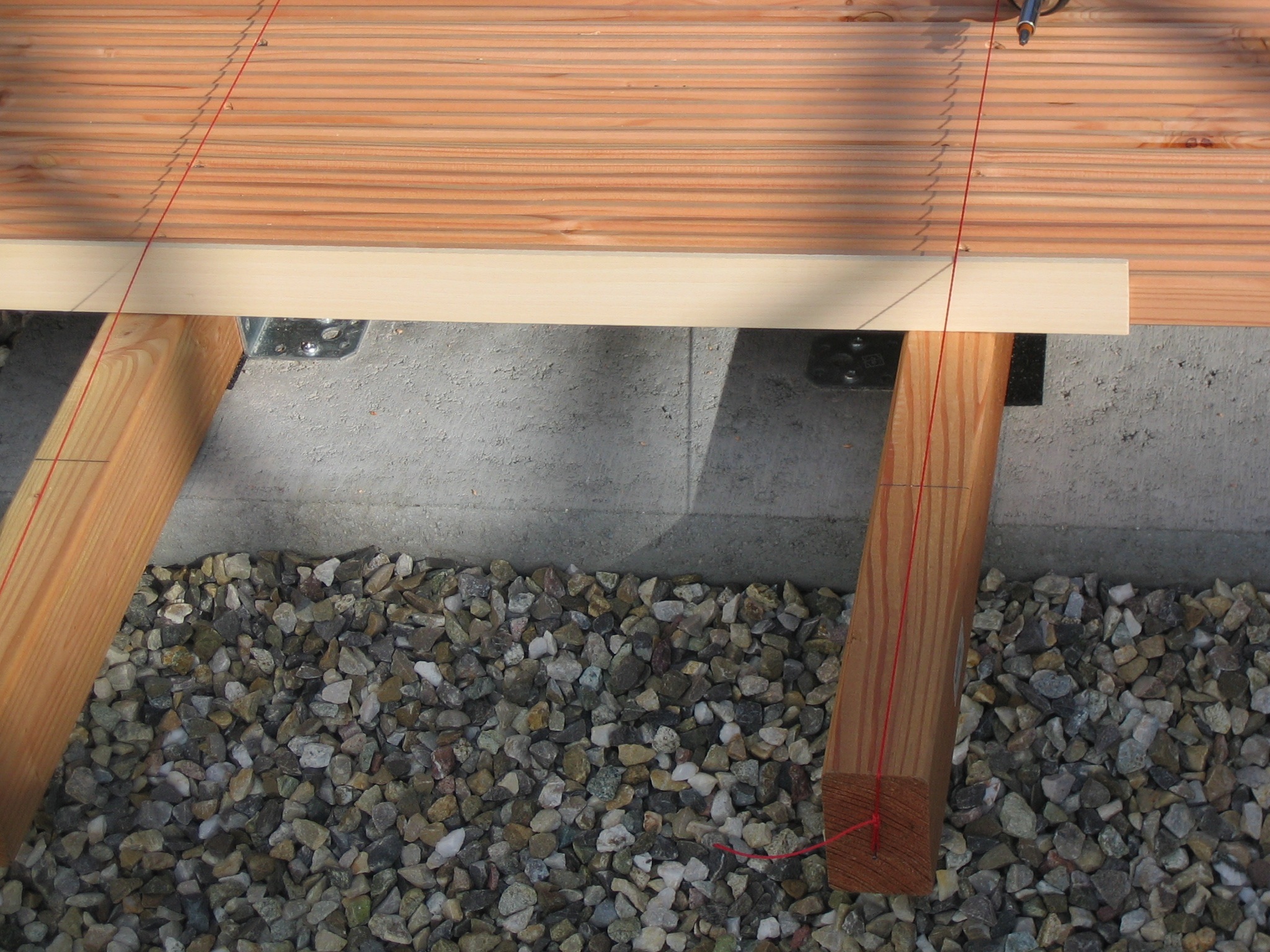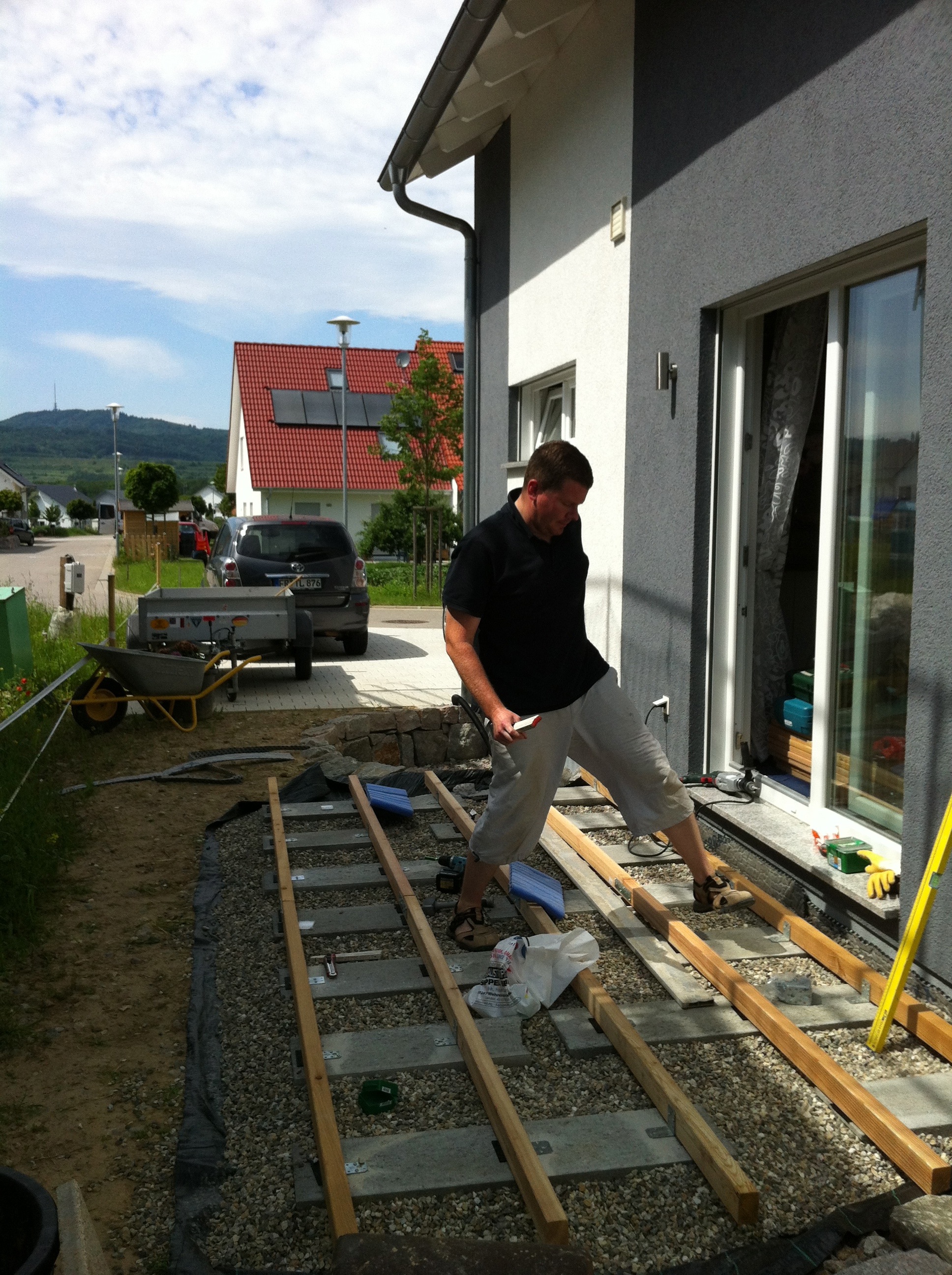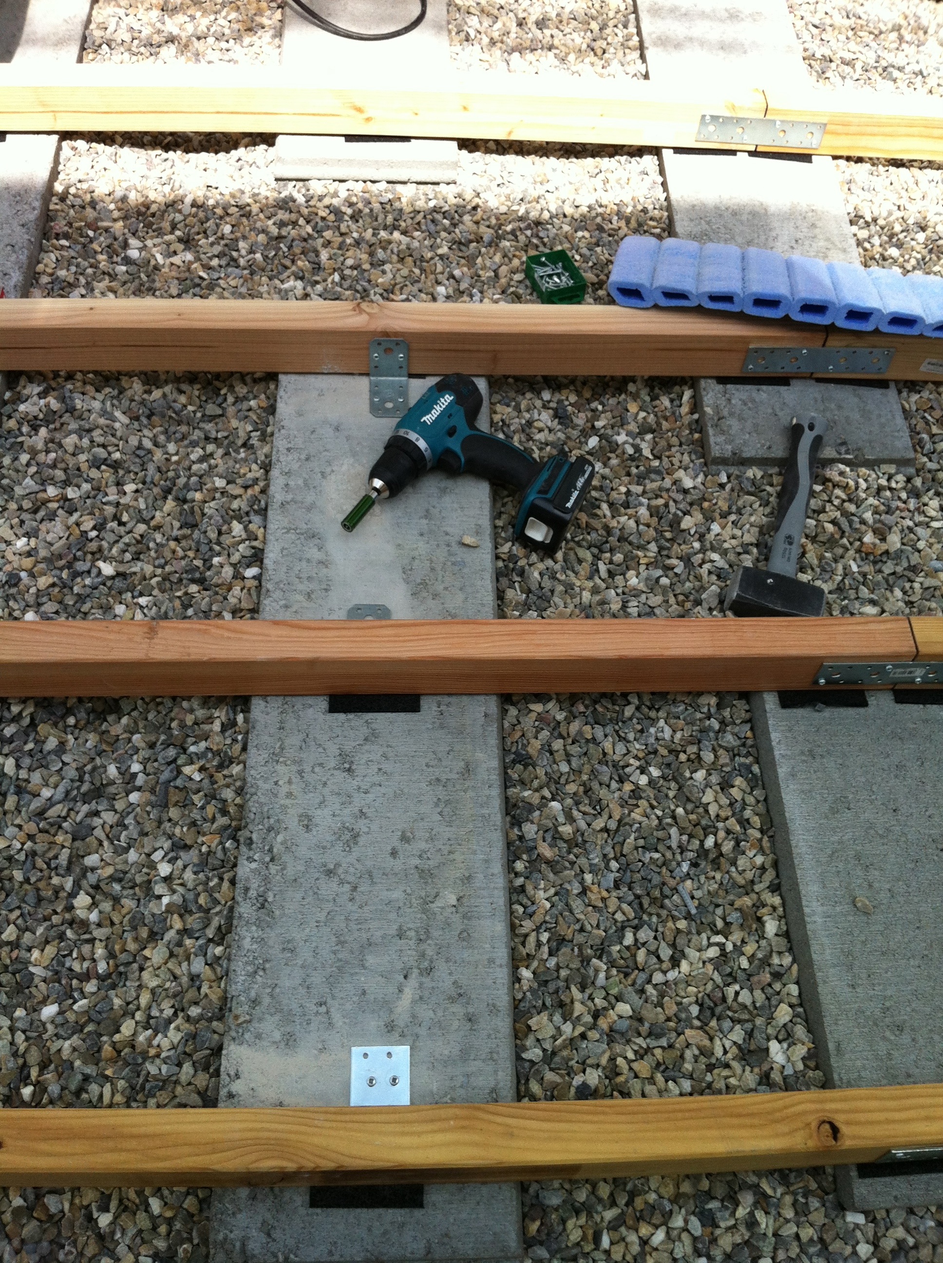 Zu Hause wurde der Split schnell abgeladen und grob mit dem Rechen verteilt. Am nächsten Tag wurde dann mit Hilfe meines Schwiegervaters der Unterbau weiter vorbereitet. Als Fundamente haben wir uns für Rasenkantensteine entschieden, die 50cm und 100cm lang sind. Ein Gefälle von 2% wurde eingemessen und hoffentlich auch eingehalten. Anschließend sind auf die Steine Winkel montiert worden und die Holzbalken verschraubt. Damit diese nicht bei Regen im eigenen Saft stehen, haben wir dünne Gummipads eingelegt. Allerdings hat diese Arbeit deutlich länger gedauert, als geplant. Mangels passendem Werkzeug war nach drei abgebrochenen Bohrern die Motivation im Keller und neues Gerät geordert.