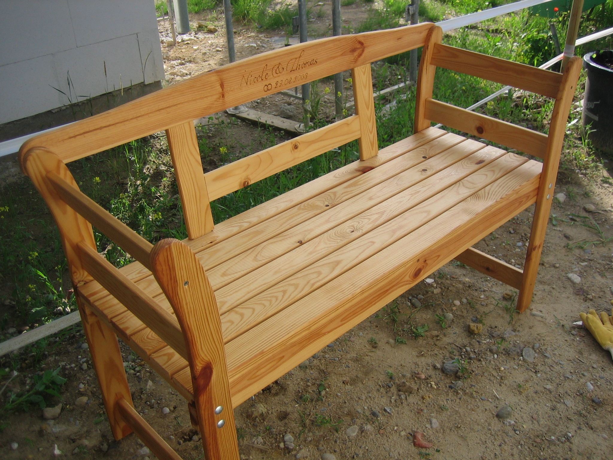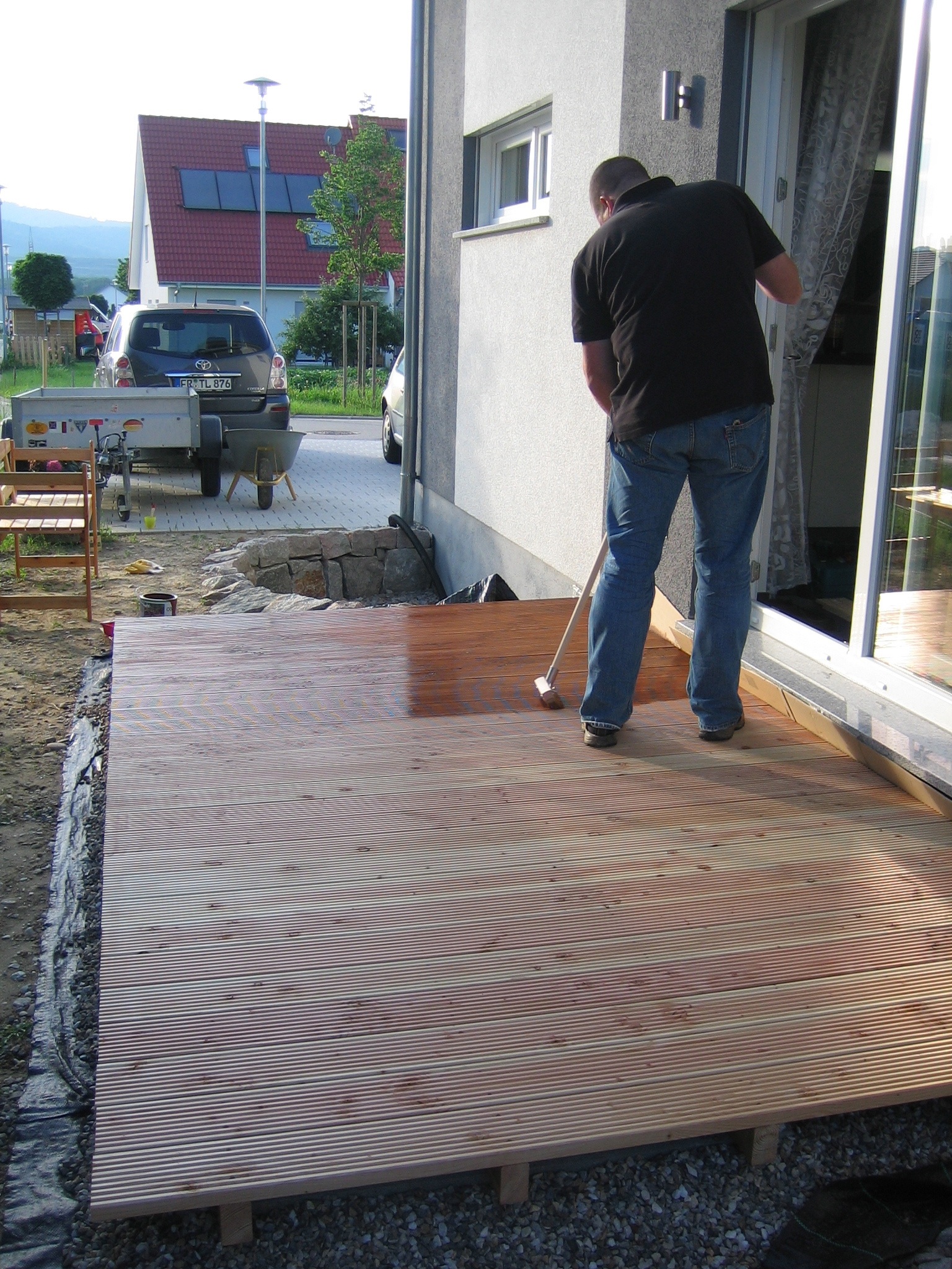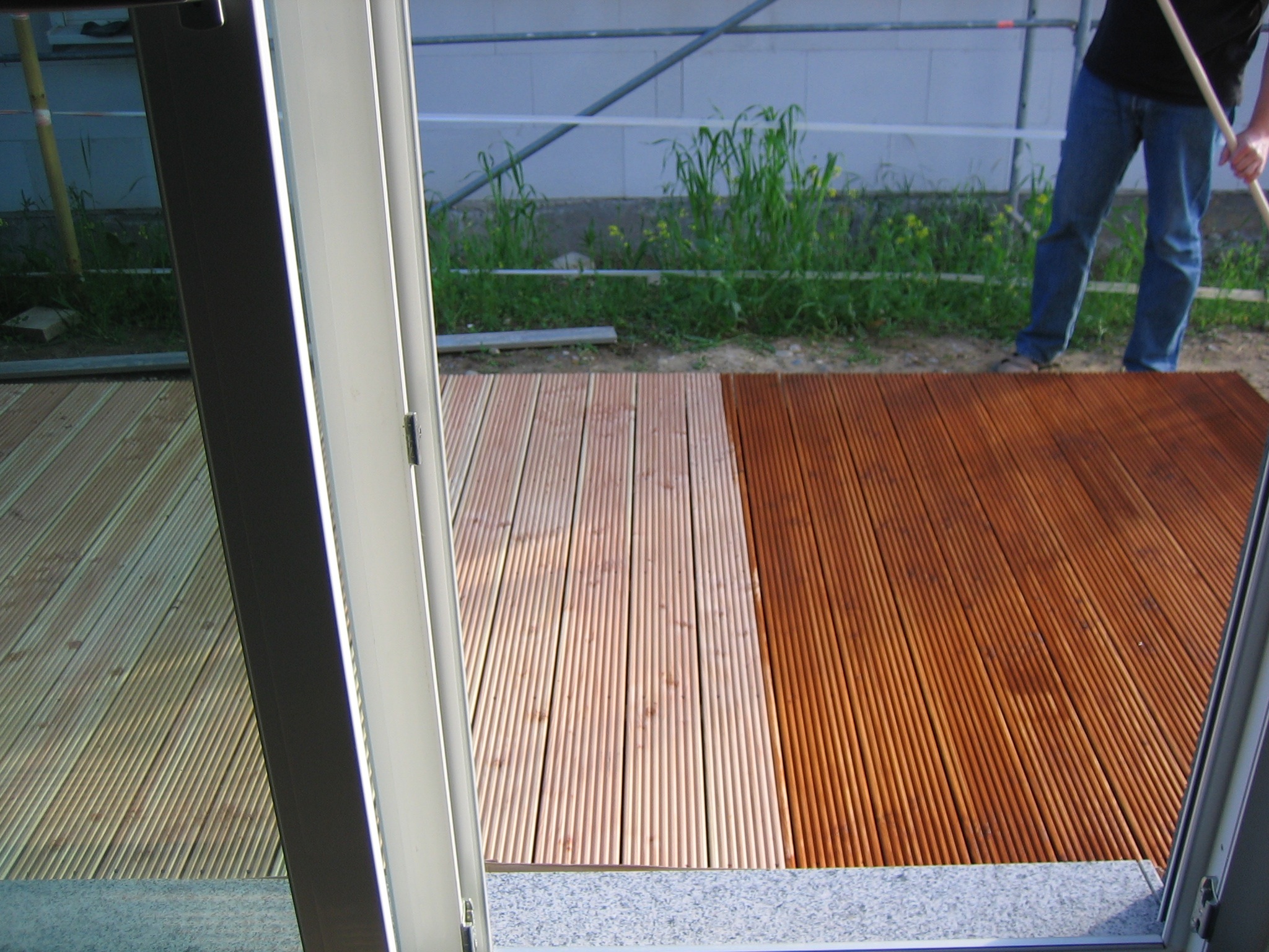 Die Bretter waren relativ schnell verschraubt, auch wenn vorsichtshalber jede Verschraubung mit 3mm vorgebohrt wurde, damit keine Risse entstehen können. Am Abend war das Werk vollbracht und damit die Douglasie nicht gleich grau wird, haben wir sie mit Holzöl behandelt und dabei gleich etwas dunkler gefärbt. Heute bekam das Holzdeck in der Regenpause ihren zweiten Anstrich verpasst und das sollte nun bis ins nächste Frühjahr reichen…