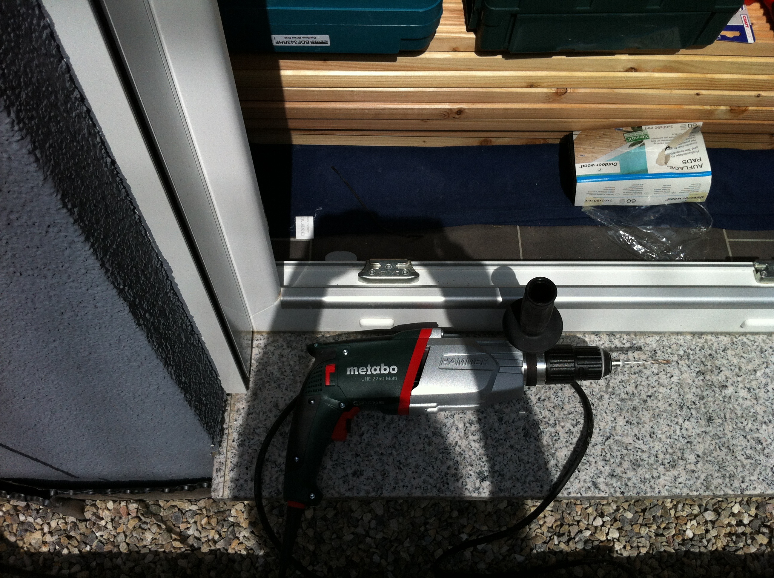 Das kam dann auch in der folgenden Woche und mit dem passenden Bohrhammer (Metabo UHE 2250) hat die ganze Arbeit wieder richtig Spaß gemacht und ging auch schnell von der Hand. Auf die Balken wurden dann die Bretter gelegt und dabei festgestellt, dass ich mich vergriffen hatte: Ursprünglich hatten wir ja mal vorgehabt, Bangkirai zu verwenden. Im Baumarkt haben wir Morado als Holz gesehen, das auch nett aussah, aber sowohl preislich als auch aus Umweltgründen hat uns dann doch die Douglasie überzeugt. Davon aber schöne Bretter zu finden, war schwieriger als gedacht. Nach gefühlten fünf Stunden hatten wir dann genügend Bretter ausgesucht, dabei aber übersehen, dass wir Bretter mit nur 12 cm Breite statt 14,5 cm gewählt hatten. Also nochmal nachkaufen und feststellen, dass die neue Lieferung von Holz deutlich schöner ist, als die letzte.