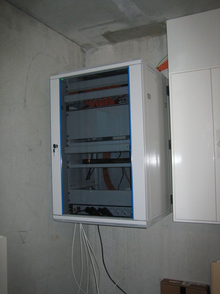Im Keller hängt endlich ein Netzwerkschrank und die ganzen (fast) Kabel, die vorher aufgerollt aus der Decke hingen, sind nun auf einem Patchpanel angeschlossen. Jetzt kommen noch die TV-Kabel dazu und dann ist das Kapitel auch abgeschlossen.